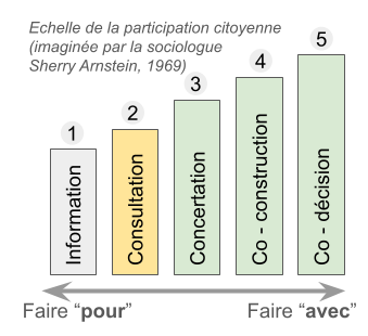 - La consultation est un recueil d’avis : il s’agit de recevoir les avis des citoyens ou parties prenantes du projet. Ces contributions peuvent être prise ou non en compte, sans nécessaire retour ou argumentation du décisionnaire (ex. référendum, enquêtes, conseils de quartier…).