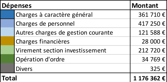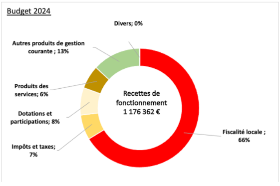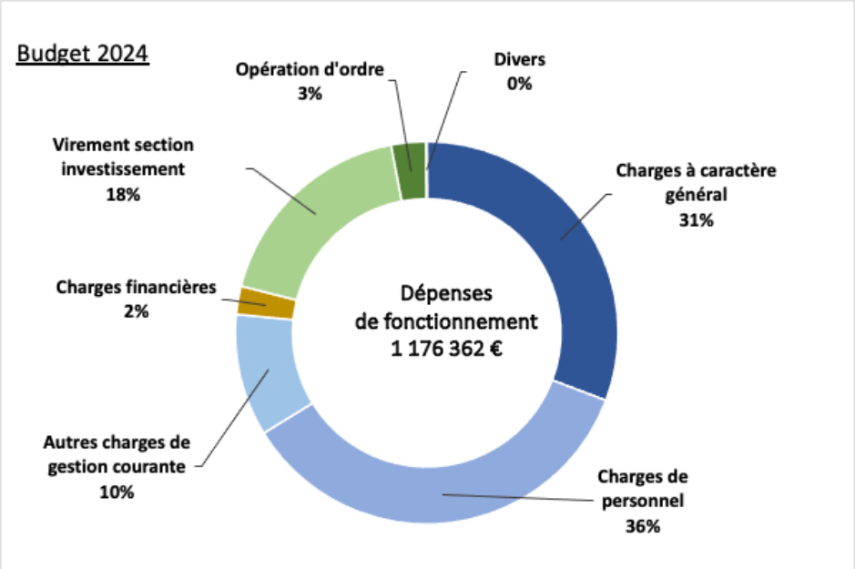 Le budget de fonctionnement 2024 est proche de 1,2 M€ avec des charges de fonctionnement proches de 1,0 M€ dégageant un solde de 212 K€ affecté à l’investissement.