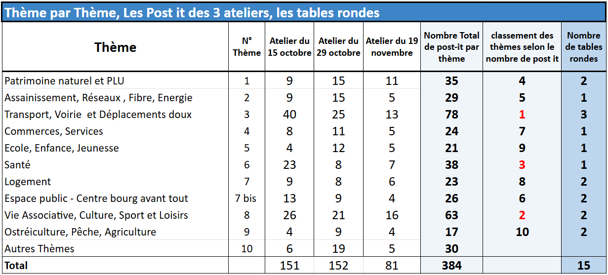 Le tableau ci-dessous relate la collecte de 384 post-it et les travaux de 15 tables rondes.